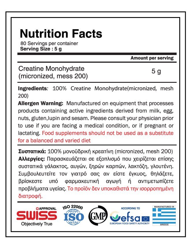 Δοσολογία: Καταναλώστε 5 γρ.(=10ml στο scoop) καθημερινά. Κατά προτίμηση καταναλώστε πριν ή/και μετά την προπόνηση, μαζί με χυμό ή άλλο υδατάνθρακα, καθώς τα σάκχαρα των υδατανθράκων αυξάνουν την απορρόφηση της κρεατίνης.