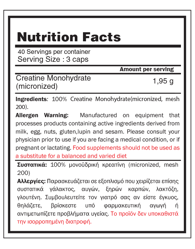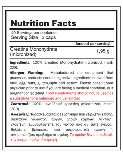 Σημ: Μην καταναλώνετε πολύ κοντά με καφέ ή άλλο ποτό που περιέχει καφεΐνη. Πίνετε λίγο χυμό ή καταναλώνετε μαζί με μια άλλη πηγή υδατανθράκων, προκειμένου να προωθήσετε την απορρόφηση κρεατίνης. Η μονοϋδρική κρεατίνη είναι κατάλληλη για χορτοφάγους και ανθρώπους που δεν καταναλώνουν αρκετό κρέας μέσω της διατροφής τους.