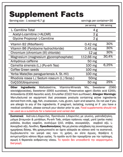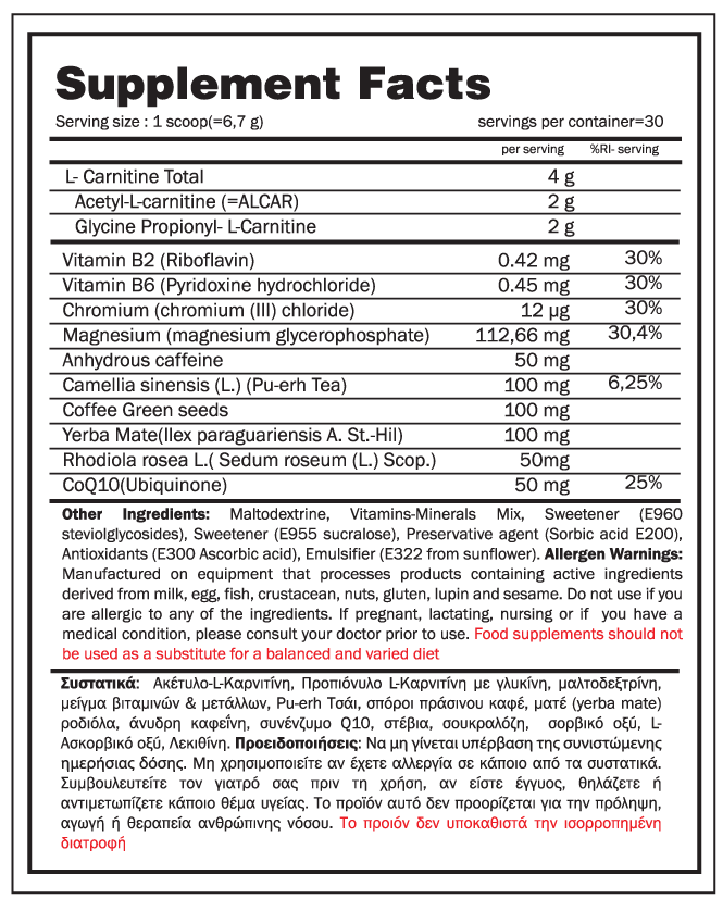2γρ. Alcar (Acetyl-L-Carnitine) δηλαδή ένα τροποποιημένο μόριο καρνιτίνης, το οποίο θεωρείται πιο ισχυρό, καθώς έχει μεγαλύτερη βιοδιαθεσιμότητα και αυξημένη απορρόφηση. Συγκεκριμένα η Acetyl-L-Carnitine (ALC) υποστηρίζει την παραγωγή της κυτταρικής ενέργειας, βοηθώντας στη μεταφορά του λίπους στα μιτοχόνδρια, όπου μετατρέπεται σε ΑΤΡ (κυτταρικό καύσιμο). Επίσης, βοηθάει στη διαδικασία της θερμογένεσης (παραγωγή θερμότητας) από το υποδόριο λίπος και συμβάλλει στην ρύθμιση της γλυκονεογένεσης. Έχει αποδειχθεί ότι βοηθά στη μείωση της γλυκόζης στο αίμα και επιτρέπει στο σώμα να χρησιμοποιεί το αποθηκευμένο λίπος για ενέργεια πιο εύκολα ειδικά για άτομα που προπονούνται με βάρη ή αντιστάσεις.