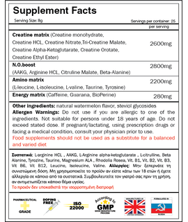 Επιπλέον περιέχει 4,6γρ. ενεργοποιητών παραγωγής νιτρικού οξειδίου Ν.Ο. όπως: L-Arginine, L-Citrulline DL-Malate, L-Arginine Alpha-Ketoglutarate 2:1, L-Citrulline, οι οποίοι προκαλούν αγγειοδιαστολή και προσφέρουν ένα ισχυρό μυϊκό pump!