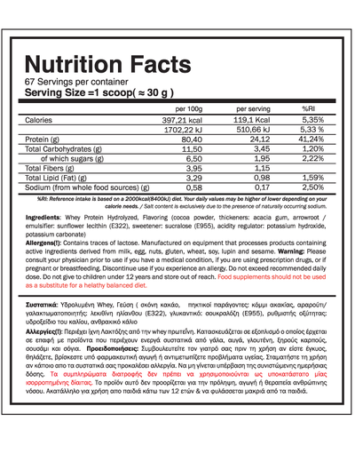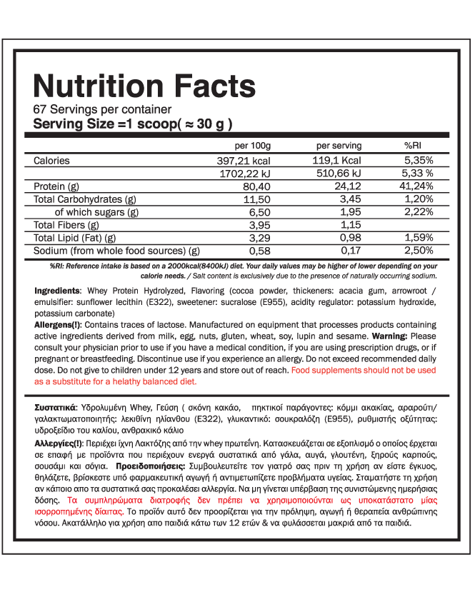 Premium καθαρή πρωτεΐνη. Παράγεται από 100% whey πρωτεΐνη μέσω ενζυματικής υδρόλυσης. Το αποτέλεσμα είναι μια προχωνευμένη πρωτεΐνη, η οποία παρέχει στον οργανισμό πεπτίδια που απορροφούνται ταχύτερα από οποιοδήποτε άλλο είδος πρωτεΐνης, εφοδιάζοντας άμεσα τους μυς με αμινοξέα.