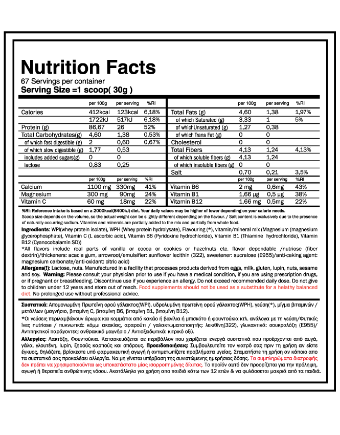 85% Whey Isolate(WPI 95) + 10% whey hydrolized(WPH 86)